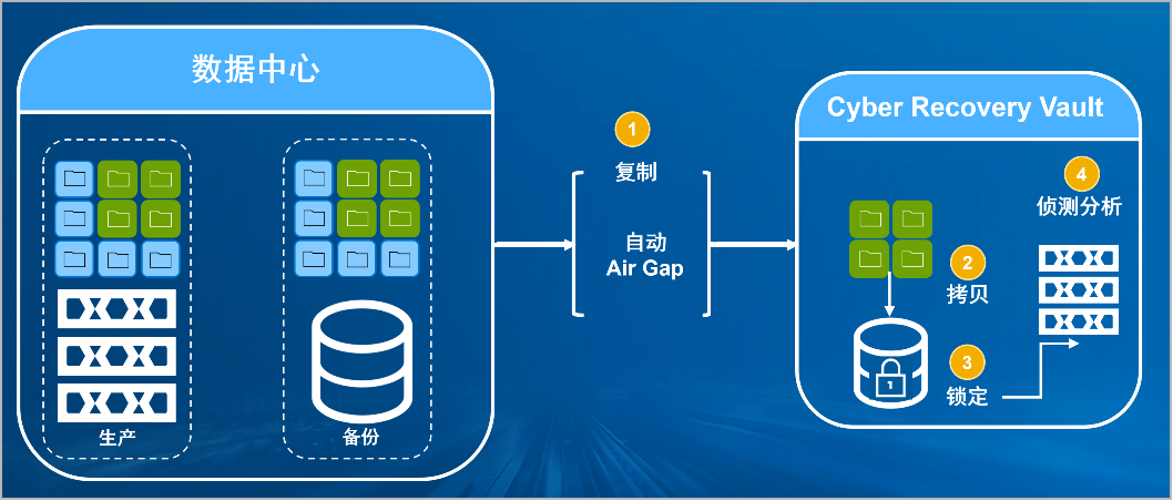 9888拉斯维加斯防勒索病毒方案将生产中心备份数据复制到Vault区,复制后网络自动断开实现弹性隔离。Vault区的数据快速拷贝,并对拷贝版本加锁(在锁定期数据不允许删除和修改)。Vault沙箱内对拷贝版本进行扫描分析,验证数据是否完好。